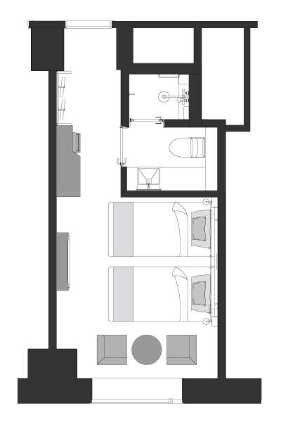 | ベッドサイズ | 幅110cm × 縦206cm 2台 ※3名様ご利用の場合はエキストラベッド(幅110cm×縦190cm)が1台入ります。 |